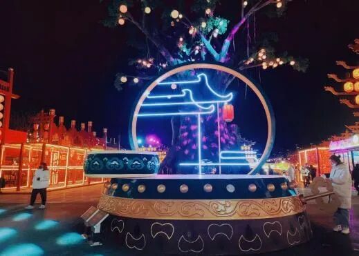 青州不夜城,青州不夜城位于山东省潍坊市青州市弥河镇大马山路999号,与云门山四季滑雪场遥相呼应,是云门山省级旅游度假区的核心项目。该项目占地约10万平方米、街区总长1.2公里,建筑面积超6万平方米,是由国艺中联科技集团投资的华宇泰富投资(北京)有限公司,以西安大唐不夜城为模板,以国潮文化为主线,结合齐鲁民俗打造的沉浸式文旅步行街区。